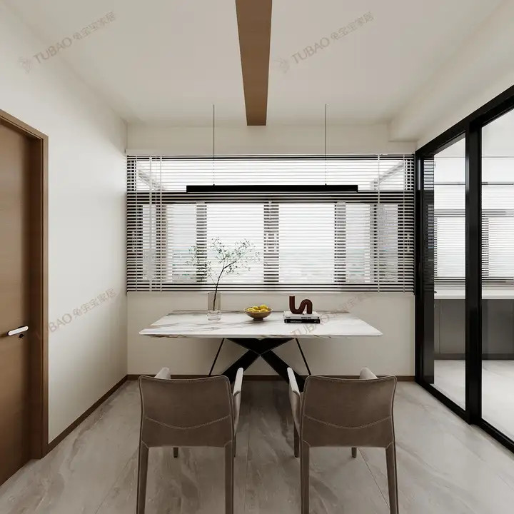搭配同色系哑光皮质餐椅,条利落、造型简约,