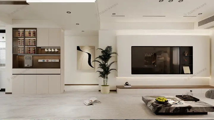 以极简悬浮电视墙为视觉中心,